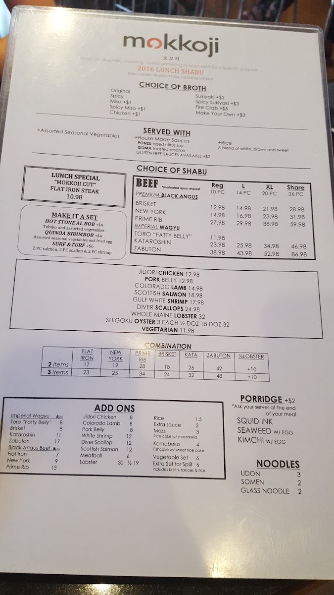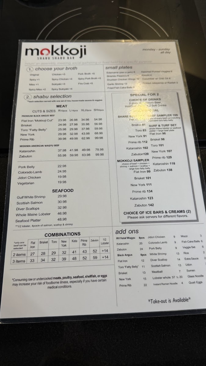Welcome to Mokkoji, an exceptional Shabu Shabu destination located in Irvine, CA. This cozy spot is famed for its premium ingredients and welcoming atmosphere, making it a must-visit for food enthusiasts. The menu boasts a variety of options including the signature Mokkoji Cut Flat Iron beef, Toro Fatty Belly, and an array of seafood choices like Gulf White Shrimp and Diver Scallops dinners, each thoughtfully accompanied by rice and fresh veggies.